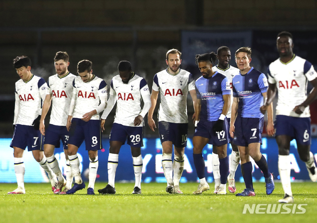 [하이위컴=AP/뉴시스]토트넘의 손흥민(왼쪽)이 25일(현지시간) 영국 하이위컴의 애덤스 파크 경기장에서 열린 2020-21 잉글랜드축구협회(FA)컵 위컴 원더러스(2부)와의 4라운드(32강) 경기에 후반 교체 출전해 탕귀 은돔벨레(왼쪽 네 번째)의 쐐기 골에 도움을 기록한 후 동료들과 돌아 나오고 있다. 토트넘은 개러스 베일의 동점 골, 해리 윙크스 역전 골과 은돔벨레의 멀티 골을 묶어 4-1로 승리했다. 2021.01.26.