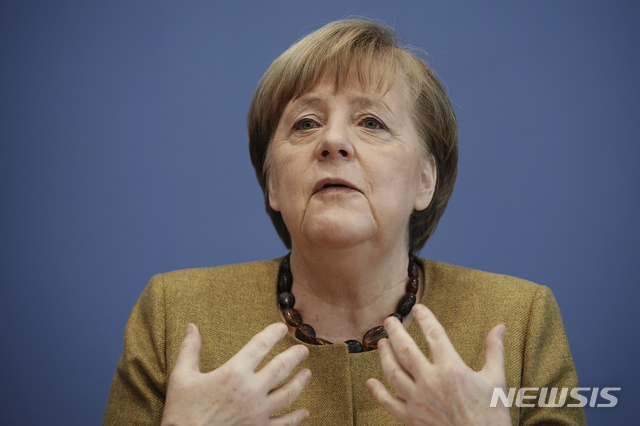 [베를린=AP/뉴시스]앙겔라 메르켈 독일 총리가 지난 21일 베를린에서 기자회견을 하고 있다. 앙겔라 메르켈 독일 총리는 26일(현지시간) 빈곤국들을 포함해 전 세계에 신종 코로나바이러스 감염증(코로나19) 백신을 공정하고 신속하게 보급해야 한다고 촉구했다. 2021.1.27