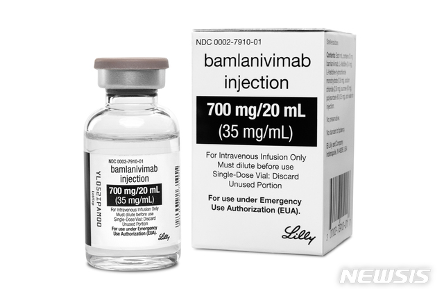 [AP/뉴시스]미 제약회사 일라이 릴리의 항체 치료제 밤라니비맵. 일라이 릴리는 26일(현지시간) 자사의 밤라니비맵과 에테세비맵이라는 2개 항체 약물을 동시 투여할 경우 고령자 또는 다른 심각한 질병 위험이 높은 사람들이 새로 신종 코로나바이러스 감염증(코로나19) 양성 판정을 받고 입원하지 못했더라도 2가지 항체를 동시 투여할 경우 입원 또는 사망 위험을 70%까지 감소시켰다고 밝혔다. 코로나19 환자들에게 항체를 공급하는 약물을 주사하면 퇴원을 앞당길 수 있으며 감염되지 않은 사람들에게 코로나19을 예방하는데에도 도움이 된다는 새로운 연구 결과들이 발표돼 희망을 주고 있다. 2021.1.27
