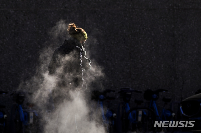 [필라델피아=AP/뉴시스]27일(현지시간) 미 펜실베이니아주 필라델피아에서 코로나19 예방을 위해 마스크를 쓴 한 남성이 맨홀에서 올라오는 증기 사이를 지나고 있다. 2021.01.28.