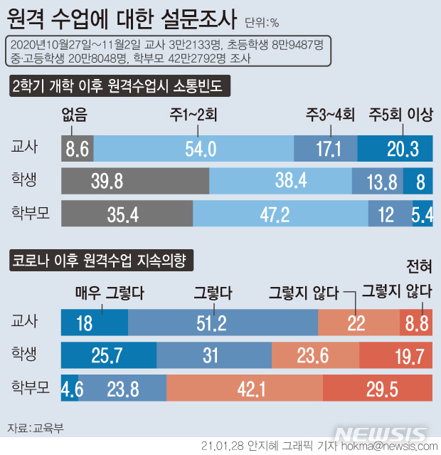 [서울=뉴시스]신종 코로나바이러스 감염증(코로나19) 이후에도 교사 10명 중 7명 가량은 원격수업을 계속할 의향이 있지만 학부모는 10명 중 7명 이상이 반대하는 것으로 조사됐다.