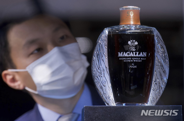 [홍콩=AP/뉴시스]28일 홍콩 본햄스 경매 사전행사에서 한 관계자가 경매 예상가 12만2500달러(한화 약 1억3700만 원)짜리 50년 된 맥켈란 라리크 위스키를 전시하고 있다. 코로나19 대유행으로 인한 경제적 불확실성 속에서도 희귀 위스키에 대한 관심은 여전히 높아 본햄스 관계자는 "지난 10년 동안 수집용 위스키는 다른 투자상품에 비해 가격이 4배나 오르며 강세를 보인다"라고 밝혔다. 2021.01.28.