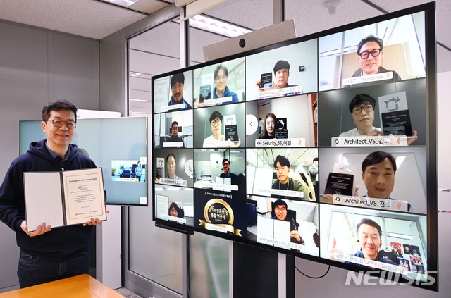 [서울=뉴시스]LG전자는 최근 AI(인공지능), 빅데이터, 코딩, 보안, 아키텍트(Architect) 분야 소프트웨어 전문가 51명을 선발했다고 2일 밝혔다. 1일 온라인으로 진행한 소프트웨어 전문가 인증식에는 CTO(최고기술책임자, 왼쪽) 박일평 사장과 인증을 받은 직원들이 참석했다. (사진=LG전자 제공) 2021.02.02. [email protected]