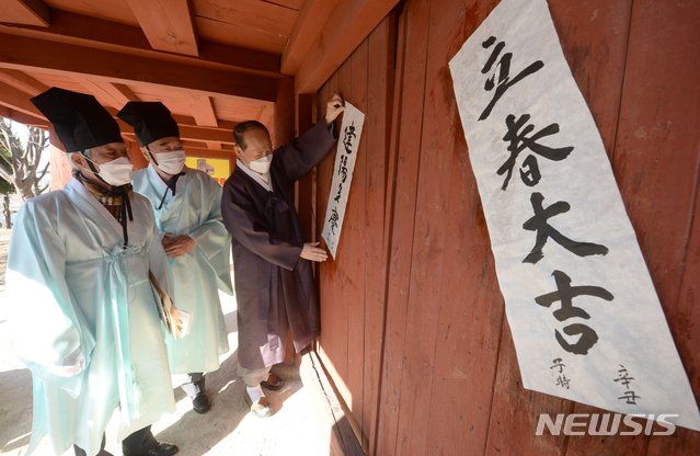 [울산=뉴시스] 배병수 기자 = 24절기 중 첫 번째 절기인 입춘(立春)을 하루 앞둔 2일 오전 울산 중구 울산향교 유림들이 출입문에 ‘입춘대길(立春大吉)’, ‘건양다경(建陽多慶)’이 적힌 입춘첩을 붙이고 있다. 2021.02.02.