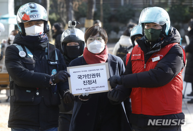 [서울=뉴시스]고승민 기자 = 민주노총 서비스연맹 서비스일반노조 배달서비스지부 조합원들이 2일 서울 국가인권위원회 앞에서 '배달라이더 무시하는 갑질 아파트, 빌딩 문제 해결 요구 및 국가인권위 진정 기자회견'을 마치고 진정서를 들어 보이고 있다. 2021.02.02. [email protected]
