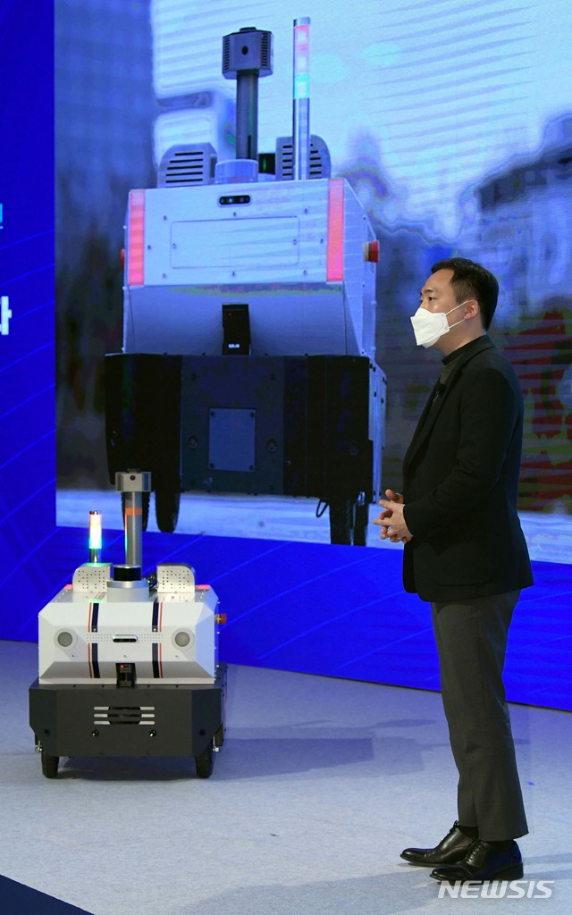 [서울=뉴시스]고승민 기자 = 2일 서울 중구 대한상의에서 열린 규제샌드박스 2주년 성과보고회에서 김진효 도구공간 대표가 규제샌드박스 실증특례를 부여받은 실외자율주행 순찰로봇 '패트로버'를 소개하고 있다. (공동취재사진) 2021.02.02. [email protected]