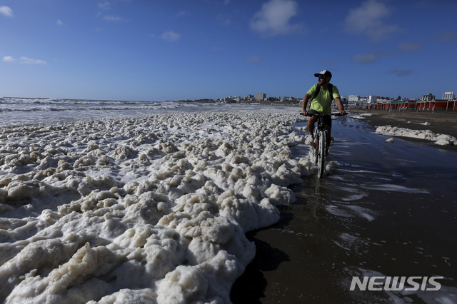 [마르델플라타=AP/뉴시스]3일(현지시간) 아르헨티나 마르델 플라타 해안가를 뒤덮고 있는 해양 거품을 지나 자전거를 탄 사람이 페달을 밟고 있다. 전문가들은 해조류가 파도와 뒤섞이면서 자연스럽게 거품이 발생한다고 밝혔다. 2021.02.04.
