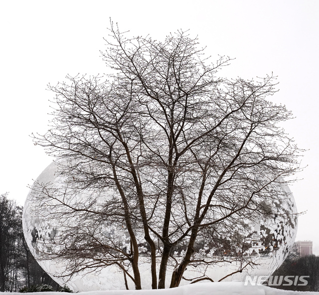 [시카고=AP/뉴시스]4일(현지시간) 미 일리노이주 시카고의 밀레니엄 공원에 조각가 아니시 카푸어의 눈 덮인 스테인리스 스틸 작품 '클라우드 게이트'를 배경으로 나무 한 그루가 조화를 이뤄 겨울 풍경을 자아내고 있다. 2021.02.05.