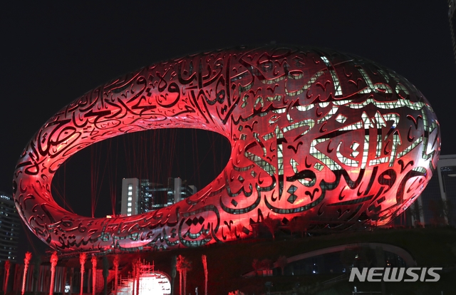 [두바이=AP/뉴시스]아랍에미리트(UAE)의 화성탐사선 '아말'(희망)이 화성 궤도에 접근하는 것을 축하해 5일(현지시간) 두바이에 있는 미래 박물관이 붉게 물들어 있다. '아말'은 오는 9일 화성 궤도에 진입할 것으로 알려졌다. 2021.02.06.