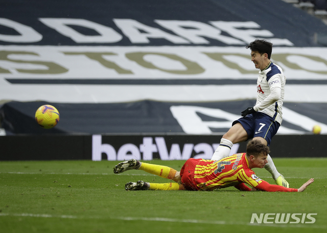 [런던=AP/뉴시스]토트넘 손흥민이 7일(현지시간) 영국 런던의 토트넘 홋스퍼 스타디움에서 열린 웨스트 브로미치 앨비언(WBA)과의 2020-2021 잉글랜드 프리미어리그(EPL) 23라운드에 선발 출전해 후반 13분 팀의 추가 골을 넣고 있다. 손흥민은 선제골을 넣은 해리 케인과 함께 팀의 2-0 승리를 이끌었으며 리그 13호 골을 기록해 득점 부문 공동 2위에 올랐다. 2021.02.08.