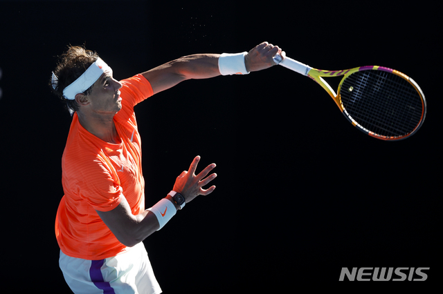 [멜버른=AP/뉴시스]라파엘 나달(2위·스페인)이 9일 호주 멜버른의 멜버른파크에서 열린 호주오픈 남자 단식 1회전에서 라슬로 제레(56위·세르비아)와 경기하고 있다. 나달은 제레를 세트스코어 3-0(6-3 6-4 6-1)으로 완파하고 2회전에 올랐다. 2021.02.09.