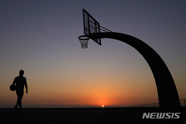 [로스앤젤레스=AP/뉴시스]10일(현지시간) 미 캘리포니아주 로스앤젤레스의 산페드로에 있는 한 공원의 해 지는 농구장에서 한 남성이 농구공을 튕기고 있다. 2021.02.11.