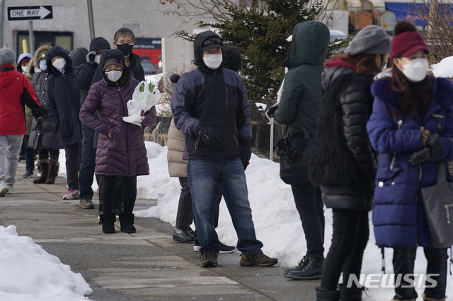 [펠리사이드파크=AP/뉴시스]11일(현지시간) 미 뉴저지주 팰리세이드 파크에서 뉴저지한인회가 주최한 설맞이 행사가 열려 참석자들이 행사가 시작하기를 기다리고 있다. 이날 한인회 자원봉사자들은 떡국용 떡과 마스크, 손 세정제 등이 들어 있는 꾸러미를 나눠주었다. 2021.02.12.
