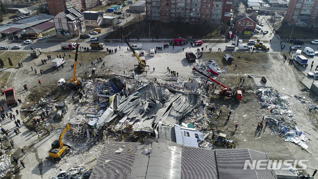 [블라디카프카즈=AP/뉴시스]12일(현지시간) 러시아 블라디카브카즈에서 강력한 폭발이 발생해 소방대원들이 현장에서 대응하고 있다. 현지 당국은 한 슈퍼마켓에서 가스가 폭발해 건물이 파괴됐으며 다행히 부상자는 없는 것으로 보인다고 밝혔다. 2021.02.13.