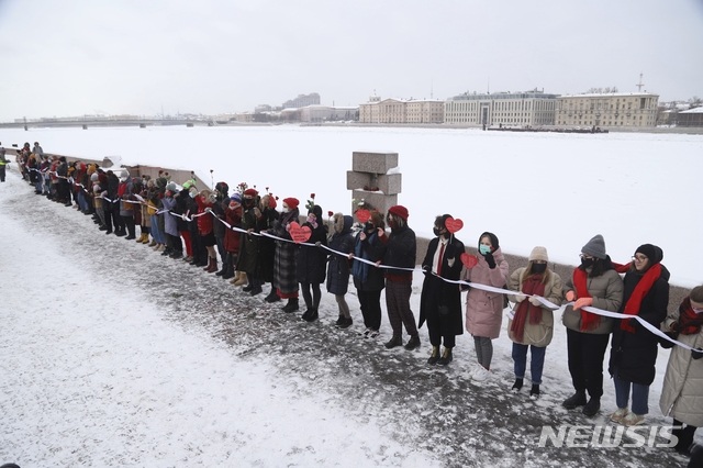 [상트페테르부르크=AP/뉴시스]14일(현지시간) 러시아 상트페테르부르크에서 러시아 야권 지도자 알렉세이 나발니와 그의 아내 율리아를 지지하는 여성들이 인간 띠를 형성하고 나발니의 석방을 촉구하는 시위를 벌이고 있다. 2021.02.15.