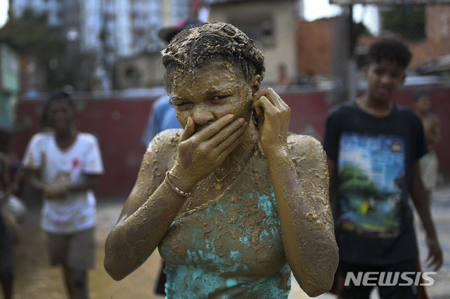 [카라카스=AP/뉴시스]15일(현지시간) 코로나19 대유행 중에 베네수엘라 카라카스의 핀토 살리나스에서 카니발이 열려 한 참가 소녀가 얼굴에 묻은 진흙을 닦아내고 있다. 2021.02.16.
