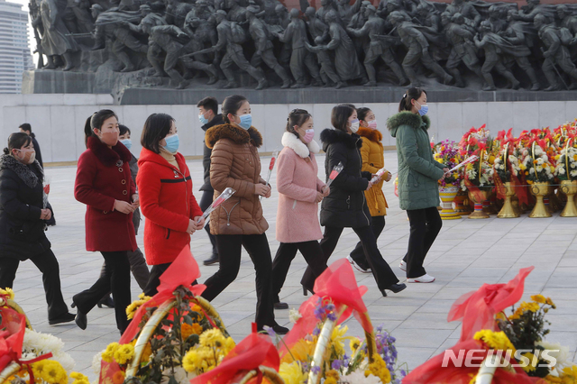 [평양=AP/뉴시스]김정일 북한 전 국방위원장의 79번째 생일인 '광명성절'을 맞아 16일 북한 평양의 만수대를 찾은 평양 시민들이 김일성 주석과 김정일 국방위원장의 동상에 헌화하고 있다. 2021.02.16.