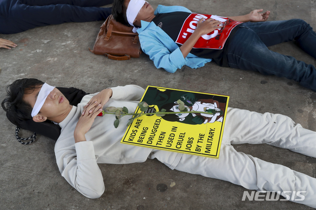 [양곤=AP/뉴시스]16일 미얀마 양곤에서 군사 쿠데타 반대 시위대가 눈을 가린 채 바닥에 누워 군정 아래서의 그들의 삶은 죽은 것이나 다름없다는 것을 표현하고 있다. 2021.02.16.