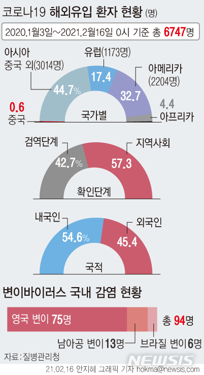[서울=뉴시스] 16일 질병관리청에 따르면 2월2주까지 국내에서 확인된 '코로나19' 변이바이러스 확진자는 94명이다. 오는 24일부터 모든 해외 입국자는 유전자 증폭(PCR) 검사 음성확인서를 제출해야 하고, 격리해제 전 3회 검사를 받아야 한다. (그래픽=안지혜 기자)