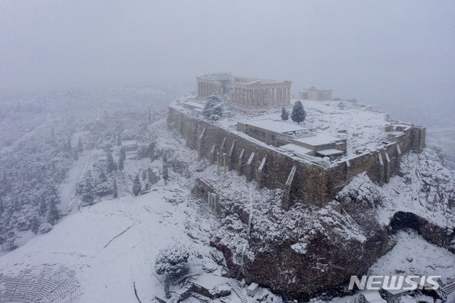 [아테네=AP/뉴시스]16일(현지시간) 그리스 아테네에 폭설이 내려 고대 아크로폴리스 언덕에 눈이 쌓이고 있다. 그리스 기상 당국은 이례적으로 아테네 지역에 폭설이 내려 북부와 동부 외곽 주민들에게 외출을 자제할 것을 당부했다. 2021.02.16.