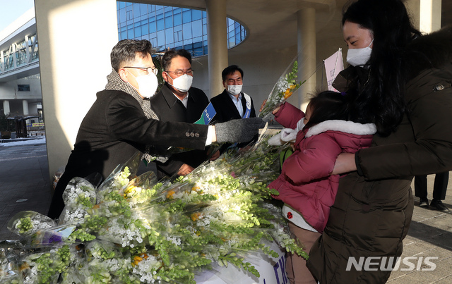 [세종=뉴시스]강종민 기자 = 김현수 농림축산식품부 장관이 17일 오전 정부세종청사에서 열린 대한민국 화훼농가 응원 캠페인에서 출근하는 직원들에게 꽃을 전달하고 있다. 2021.02.17.