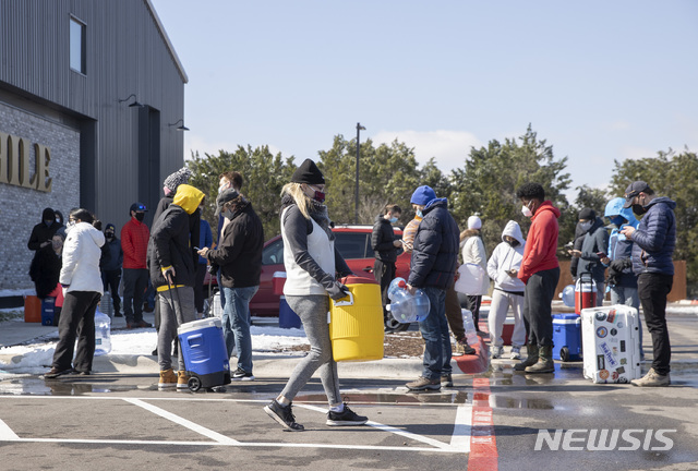 [오스틴=AP/뉴시스]19일(현지시간) 미 텍사스주 오스틴 주민들이 양조업체 '그랜드 브루잉 컴퍼니'에서 물을 받기 위해 줄 서서 기다리고 있다. 이 양조장은 이틀에 걸쳐 그들의 물 4000갤런(약 1만5000ℓ)을 지역 주민들에게 나눠줬다. 2021.02.20.