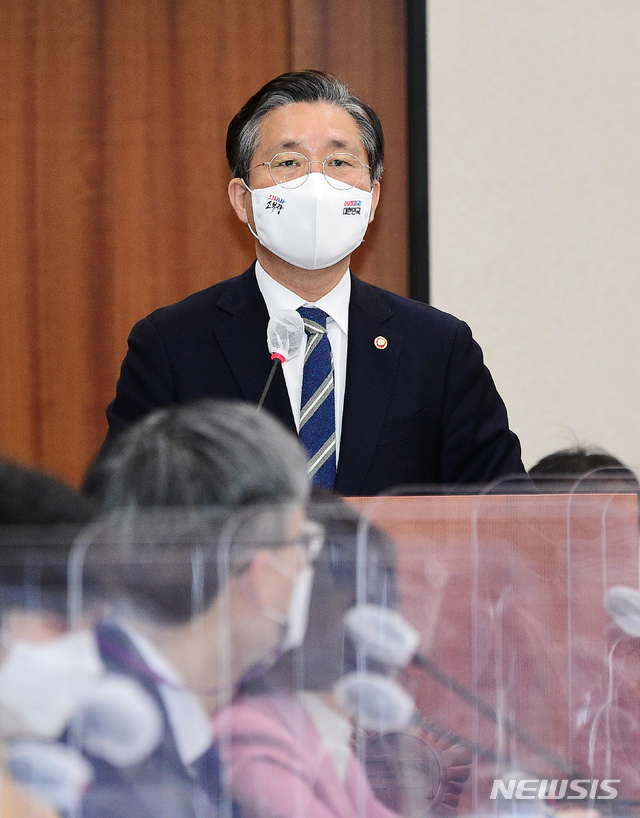 [서울=뉴시스]전진환 기자 = 성윤모 산업통상자원부 장관이 23일 국회에서 열린 산업통상자원중소벤처기업위원회에서 발언을 하고 있다. (공동취재사진) 2021.02.23. [email protected]