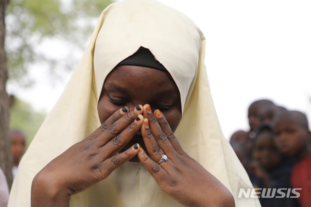 [장게베=AP/뉴시스]26일(현지시간) 나이지리아 장게베에 있는 국립여자중학교에서 무장 괴한들의 공격으로 학생들이 납치된 가운데 납치를 면한 한 학생이 고개를 숙이고 괴로워하고 있다. 경찰은 괴한들이 학생 317명을 납치해 구출 작전에 돌입했다고 밝혔다. 2021.02.27.