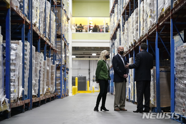 [휴스턴=AP/뉴시스]조 바이든(가운데) 미국 대통령이 부인 질 바이든 여사와 함께 26일(현지시간) 텍사스주 휴스턴에 있는 지역 봉사단체인 텍사스 푸드뱅크를 방문해 둘러보고 있다. 바이든 대통령 부부는 한파로 피해를 본 텍사스주를 방문해 봉사자들을 격려하는 한편 연방 정부의 지원을 강조했다. 2021.02.27.