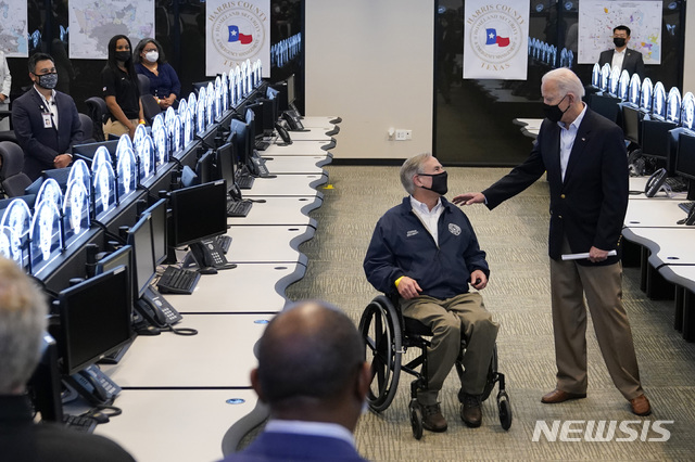 [휴스턴=AP/뉴시스]조 바이든 미국 대통령이 26일(현지시간) 텍사스주 휴스턴에 있는 해리스 카운티 비상 센터를 둘러보며 그레그 애벗 텍사스 주지사와 얘기하고 있다. 2021.02.27.