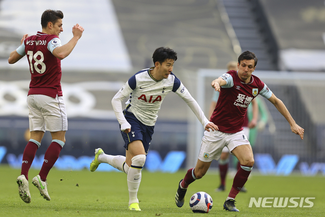 [런던=AP/뉴시스]토트넘의 손흥민이 2월28일(현지시간) 영국 런던의 토트넘 홋스퍼 스타디움에서 열린 번리와의 2020-21시즌 잉글랜드 프리미어리그(EPL) 26라운드에 선발 출전해 드리블하고 있다. 손흥민은 전반 1분과 후반 10분 개러스 베일의 골을 도우며 리그 7,8호 도움을 올렸고 토트넘은 4-0으로 완승했다. 2021.03.01.