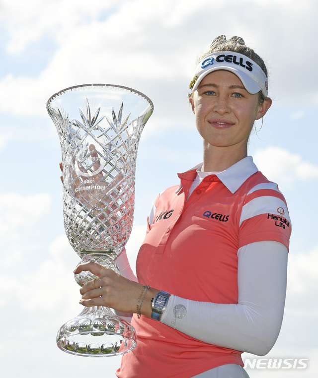 [올랜도=AP/뉴시스]넬리 코르다(4위·미국)가 2월28일(현지시간) 미 플로리다주 올랜도의 레이크 노나 GC에서 막을 내린 미국여자프로골프(LPGA) 투어 게인브리지 LPGA 우승을 차지한 후 트로피를 들고 포즈를 취하고 있다. 코르다는 최종합계 16언더파 272타 기록하며 LPGA 통산 네 번째 우승을 차지했다. 2021.03.01.