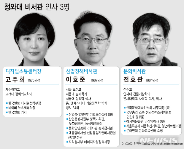 [서울=뉴시스] 문재인 대통령은 2일 신임 청와대 산업정책비서관에 이호준(54) 산업통상자원부 기획조정실장을 내정했다. 문화비서관에 전효관(58) 전 한국문화예술위원회 사무처장을, 디지털소통센터장에는 고주희(47) 한국일보 디지털전략부장을 각각 내정했다.(그래픽=전진우 기자)