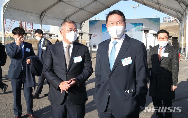 액화수소사업 예정지 둘러보는 정의선, 최태원 회장