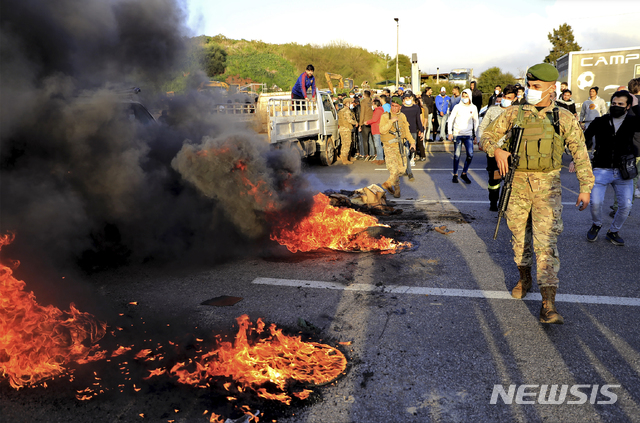 [베이루트=AP/뉴시스]2일(현지시간) 레바논 베이루트에서 군인들이 반정부 시위대가 베이루트 국제공항으로 통하는 고속도로를 막기 위해 불 지른 타이어들을 지나고 있다. 레바논 파운드화가 암시장에서 달러 대비 사상 최저치를 기록한 후 레바논 각지에서 산발적인 시위가 벌어져 레바논 새 내각 불신에 따른 각종 위기가 심화하는 징후로 풀이된다. 2021.023.03.