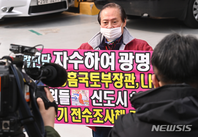 [수원=뉴시스] 김종택기자 = 한국토지주택공사(LH) 직원들의 3기 신도시 광명·시흥지구 땅투기 의혹 고발인인 시민단체 대표 홍정식씨가 3일 오후 경기도 수원시 경기남부경찰청에서 조사를 받기 앞서 기자회견을 하고 있다. 2021.03.03.