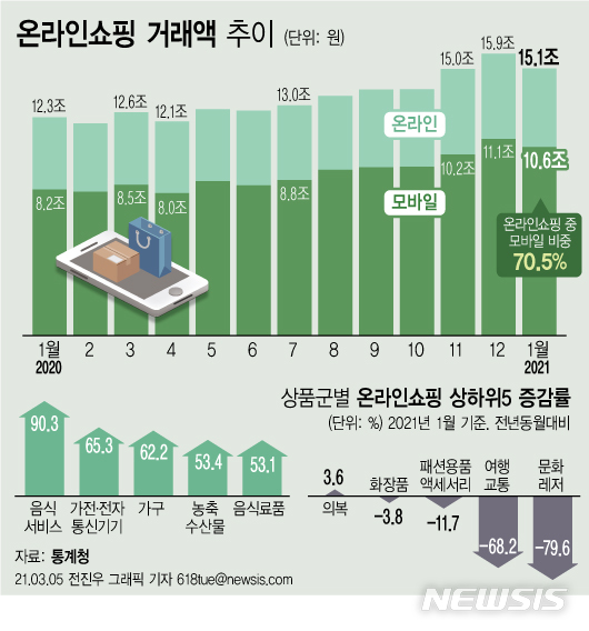 [서울=뉴시스] 5일 통계청에 따르면 지난 1월 온라인쇼핑 거래액은 1년 전보다 22.4% 증가한 15조623억원으로 집계됐다. 배달음식 주문 등 모바일을 통한 결제가 늘면서 모바일쇼핑이 차지하는 비중은 처음으로 70%를 넘겼다. (그래픽=전진우 기자)