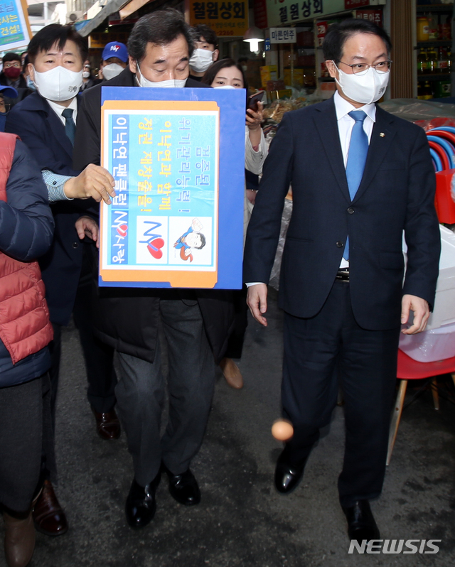 [춘천=뉴시스] 김경목 기자 = 이낙연 더불어민주당 대표가 5일 오후 민생탐방지로 찾은 강원도 춘천 중앙시장에서 중도유적지킴이본부 회원이 던진 계란을 맞았다. 이 대표 쪽으로 던져진 계란이 보인다. 오영훈 비서실장이 손팻말을 방패삼아 이 대표를 보호하고 있다. 2021.03.05.