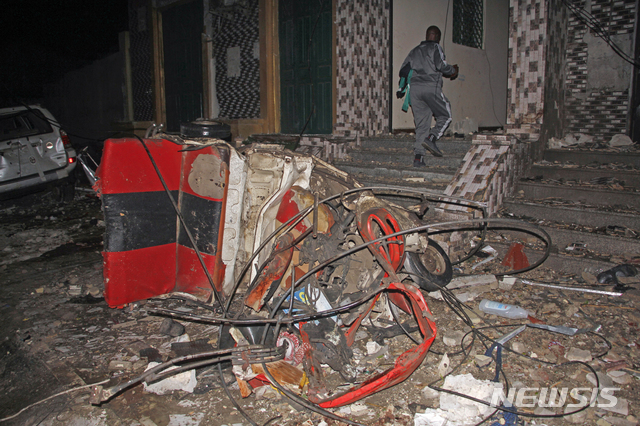[모가디슈=AP/뉴시스]5일(현지시간) 소말리아 수도 모가디슈의 한 유명 음식점에서 폭발이 일어난 후 한 남성이 현장에 남아 있는 차량 잔해를 지나가고 있다. 경찰은 이 식당에 폭발물을 가득 실은 차량이 돌진, 폭발해 최소 20명이 숨지고 30여 명이 다쳤다고 밝혔다. 2021.03.06.