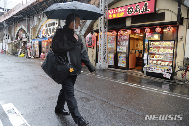 [도쿄=AP/뉴시스]8일 일본 도쿄에서 코로나19 확산 방지를 위해 마스크를 쓴 한 시민이 술집과 식당이 즐비한, 거의 텅 빈 거리를 걷고 있다. 일본 수도권은 오늘부터 21일까지 코로나19 확산 억제를 위한 긴급사태 연장에 들어간다. 2021.03.08.