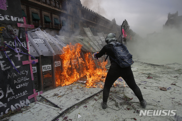 경찰 방패에 불 붙이는 멕시코 여성 시위대
