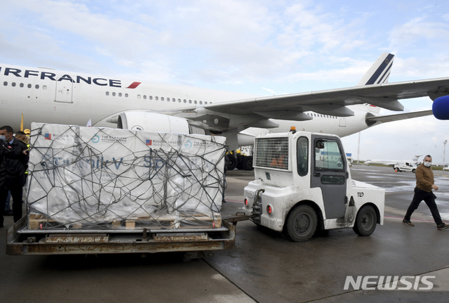 [튀니스=AP/뉴시스]9일(현지시간) 튀니지 수도 튀니스 공항에 러시아의 스푸트니크 V 백신이 담긴 화물이 도착해 이동하고 있다. 튀니지는 화이자와 아스트로제네카 백신을 비롯해 중국의 시노백 백신 1차 선적분의 도착을 기다리고 있다. 2021.03.10.