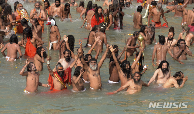[하르드와르=AP/뉴시스]11일(현지시간) 인도 우타라칸드주 하르드와르에서 힌두교 신자들이 옷을 벗고 마하 시브라트리 축제를 기념하기 위해 갠지스강에 몸을 담그고 있다. 마하 시브라트리는 시바에 대한 신앙의 서약을 확인하는 힌두교 축제다. 2021.03.12.