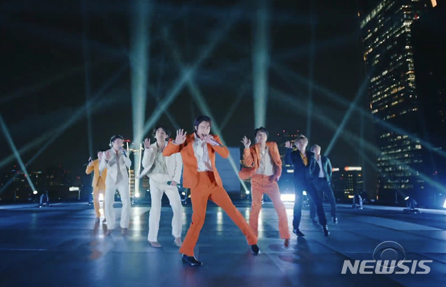 [로스앤젤레스=AP/뉴시스]방탄소년단(BTS)이 14일(현지시간) 미 캘리포니아주 로스앤젤레스의 컨벤션센터에서 열린 제63회 그래미 어워드에서 '다이너마이트'(Dynamite) 무대를 영상으로 선보이고 있다. BTS는 한국 대중가수로는 처음으로 '그래미상' 후보에 오른 데 이어 단독 무대까지 펼쳤다. 2021.03.15.