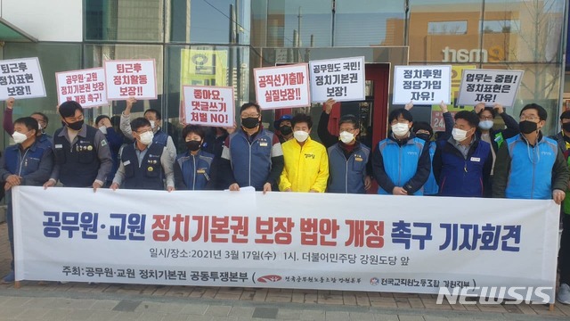 [춘천=뉴시스]김동현 기자 = 공무원노동조합·교직원노동조합 강원지부는 17일 오후 더불어민주당 강원도당 앞에서 기자회견을 열고 정치기본권 보장 법안에 대한 개정을 촉구하고 있다. 2021.03.07. [email protected]