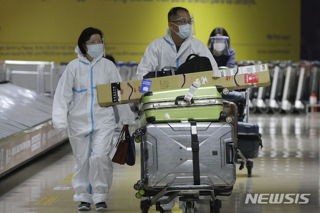 [마닐라=AP/뉴시스]17일 필리핀 마닐라의 마닐라 국제공항 입국장에 보호복을 착용한 여행객들이 들어서고 있다. 필리핀 정부는 코로나19가 크게 확산하면서 오는 20일부터 한 달간 외국인의 입국을 금지하고 귀국하는 필리핀인의 숫자를 하루 1500명으로 제한하기로 했다. 2021.03.17.