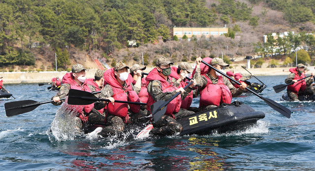 [서울=뉴시스]박미소 기자 = 17일 경남 창원 진해군항에서 제673기 해군병들이 해상 IBS 훈련을 하고 있다. IBS(Inflatable Boat Small)는 상륙작전 시 적진 해안으로 기습하기 위해 6~12명이 팀을 이루어 탑승하는 소형고무보트다. (사진=해군교육사령부 제공) 2021.03.17. [email protected] *재판매 및 DB 금지