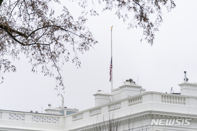 [워싱턴=AP/뉴시스]18일(현지시간) 미국 워싱턴의 백악관에 '애틀랜타 총격' 희생자를 애도하는 조기가 걸려 있다. 조 바이든 대통령은 16일 발생한 애틀랜타 총격 피해자들에 대한 애도와 존경의 표시로 조기게양을 명령해 오는 22일 일몰 때까지 백악관을 비롯한 미전역과 영토에서 조기를 게양한다. 2021.03.19.