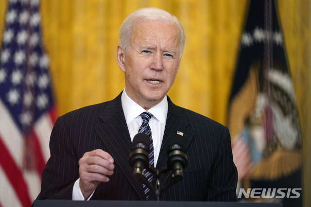 [워싱턴=AP/뉴시스]조 바이든 미국 대통령이 18일(현지시간) 백악관 이스트룸에서 코로나19와 관련해 연설하고 있다. 바이든 대통령은 16일 발생한 애틀랜타 총격 피해자들에 대한 애도와 존경의 표시로 조기게양을 명령했다. 2021.03.19.