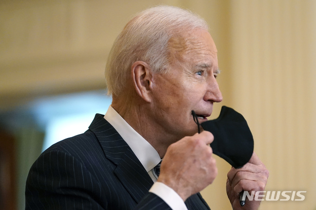 [워싱턴=AP/뉴시스]조 바이든 미국 대통령이 18일(현지시간) 백악관 이스트룸에서 코로나19와 관련한 연설에 앞서 마스크를 벗고 있다. 바이든 대통령은 16일 발생한 애틀랜타 총격 피해자들에 대한 애도와 존경의 표시로 조기게양을 명령했다. 2021.03.19.